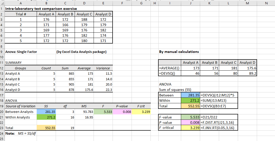 The above figure shows the manual calculations using the Excel formulae agree very well with the Excel’s calculated data by its Data Analysis package. In words, we have: