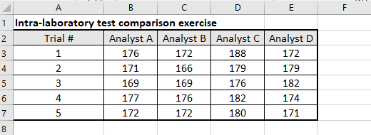 In a one-factor ANOVA (Analysis of Variance), we check the replicate results of each group under a sole factor. For example, we may be evaluating the performance of four analysts who have each been asked to perform replicate determinations of identical samples drawn from a population. Thus, the factor is “Analyst” of which we have four so-called “groups” – Analyst A, Analyst B, Analyst C and Analyst D. The test data are laid out in a matrix with the four groups of the factor in each column and the replicates (five replicates in this example) in each row, as shown in the following table: