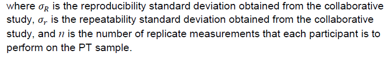 This approach to defining the standard deviation for performance evaluation is based on the results from a previous reproducibility experiment via collaborative study by using the same analytical method, if any. In this case, we can look for the reproducibility and repeatability estimates from the study.